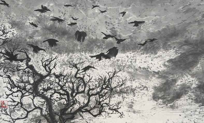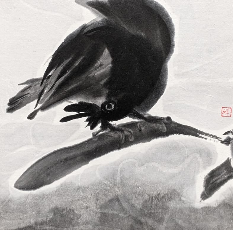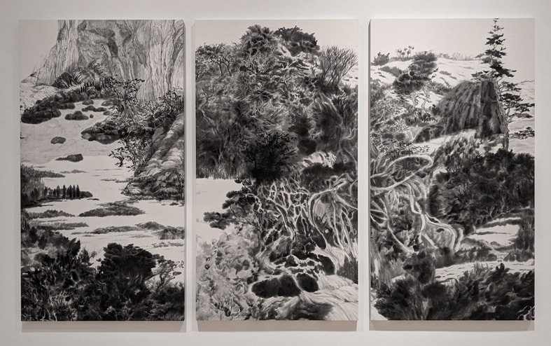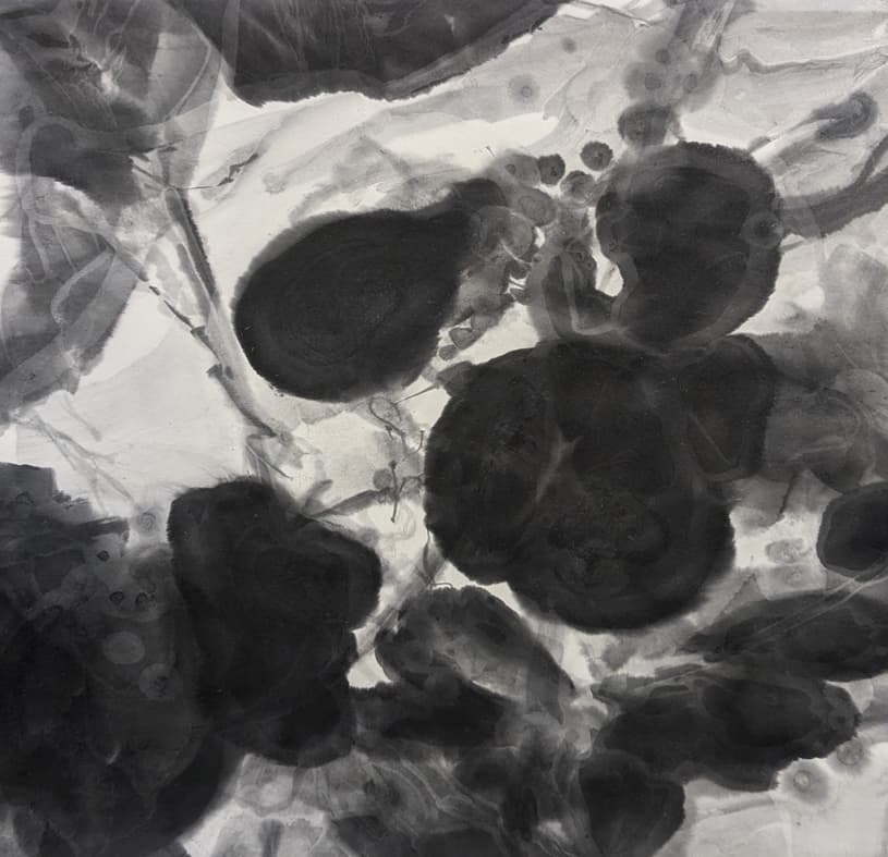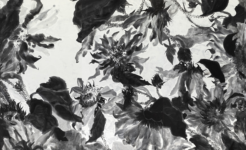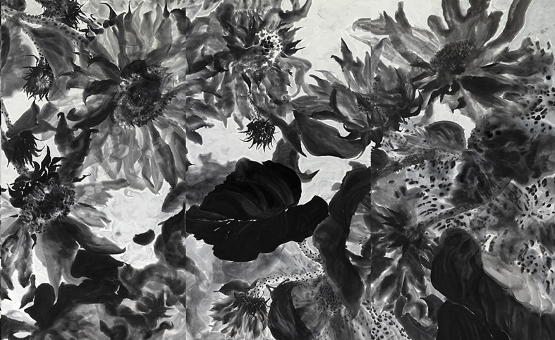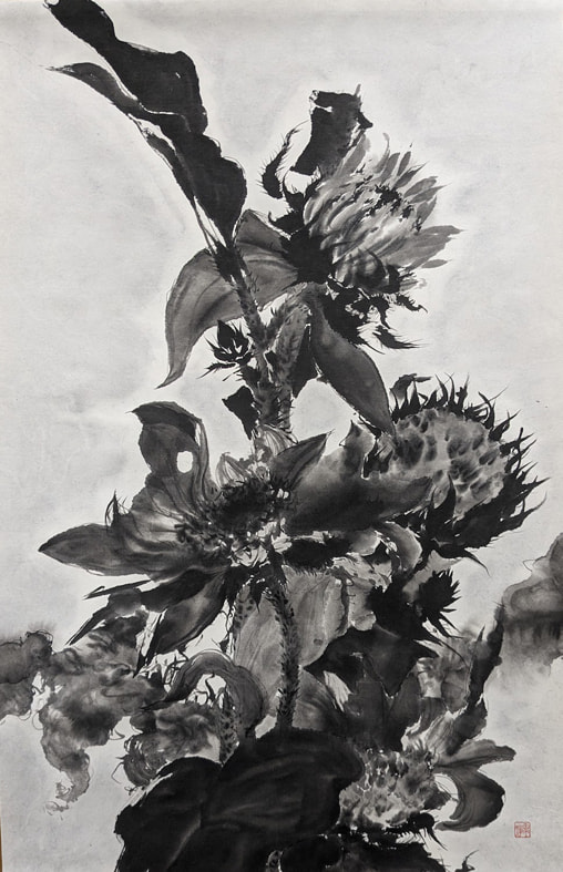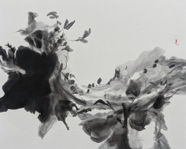 色は現象であり花の本質を表すものではない、という考えを(全ての色をその内側に持っている)墨で描く。 紙・墨・硯・筆・水・天気・温度・湿度などの条件が大事で、作品には中国の宣紙(10年以上寝かせた紙)と、古い松煙墨・油煙墨(30年~50年程前のもの)を使うことが多い。良質な墨は滲んでいこうとする様子が筆をおいた瞬間にわかる。 様々な要素をそぎ落としこれら条件の結果としての表現が出来ているか、説明的になっていないかが大事だと思う。