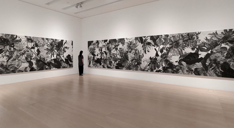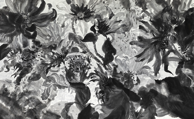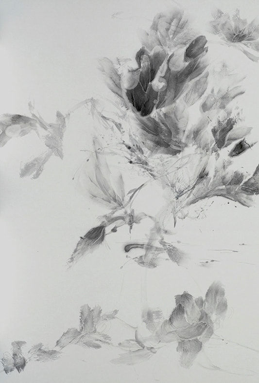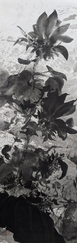 I think that color is a phenomenon and does not represent the essence of flowers. When I think about what a flower is, color interferes with it, so I want to draw its essence with Sumi-ink that has all the colors inside. There is a meaningful deep world that can only be expressed with Sumi-ink. For Sumi-ink, it must choose paper, inkstone, brush, water quality, weather, temperature, humidity, etc., and the persons condition who rubs the Sumi-ink, years of involvement, experience, etc. I usually use short-fiber Chinese paper (it has been aged for more than 10years) and old Chinese and Japanese pine and oil inks(30 to 50 years old) in my work. The moment I write, I can see how good old Sumi-ink is about to spread. However, just because the materials and conditions to be ready, does not necessarily good work will be produced. I think that stripping away various elements to make it simple and not being explanatory will lead to the expression of a deep infinite world and spiritual world.